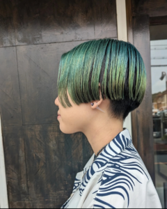 ベースのブリーチは髪を傷めすぎないようにパワーをコントロール。 グリーンの発色を最大限に引き出すため、深緑からライトグリーンへの自然なグラデーションを丁寧に作り込みました。