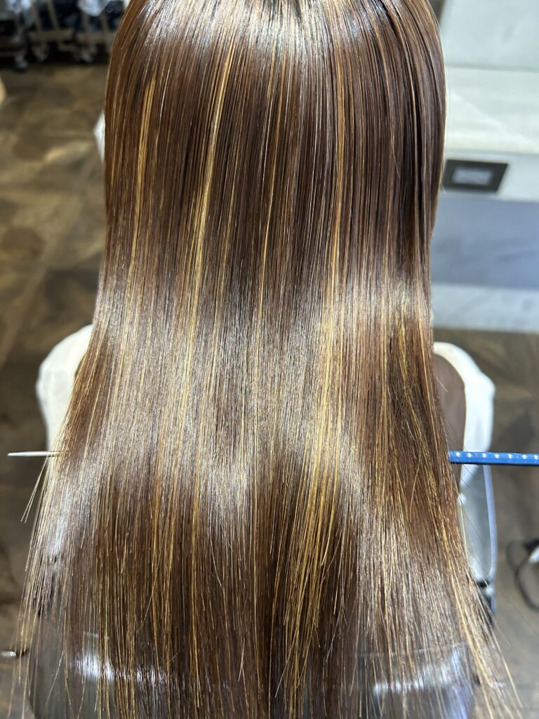 アイロンで形を整えたあと、もう一度薬剤を使用して「まっすぐの形」をしっかり固定します。これを行うことで、クセが戻らず、長くキレイな状態を楽しんでいただけます。