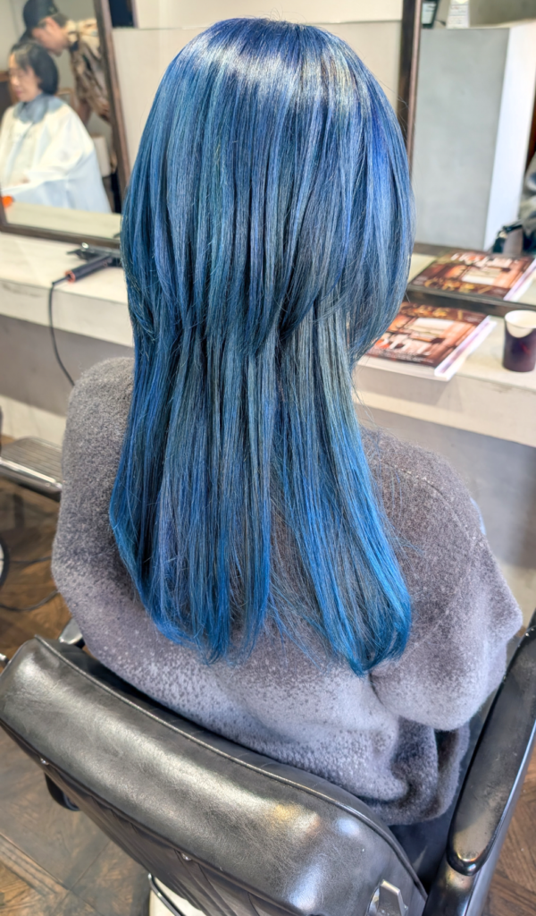 写真のような透き通るような青を実現するには、丁寧なブリーチワークが欠かせません。