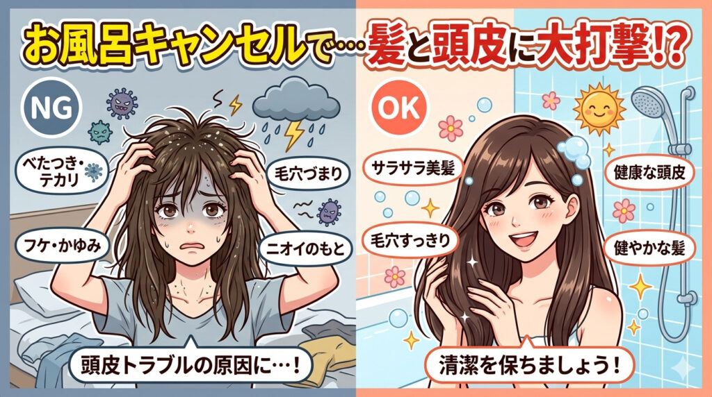 「今日は疲れたし、お風呂いいや…」いわゆる“風呂キャンセル”、誰でも一度はありますよね。たまになら問題ありませんが、これが続くと髪や頭皮にはしっかり影響が出てきます。