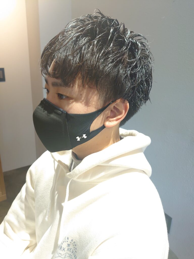 サイドを6ミリの2ブロック、バックを6ミリからスタートの刈り上げにして全体を軽いイメージにならないように少し重めのマッシュショートにカットをしています!!